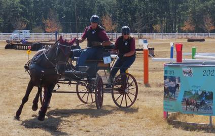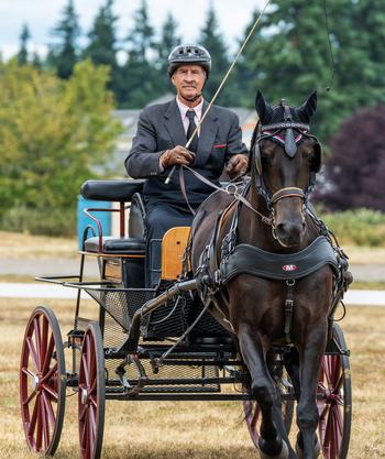Don drove Okan Duchess (Karenza Orion x Karenza Queen of Hearts). Duchess is a 16 year old momma of 4 and hadn't driven since she was 6. It didn't seem to phase her, once she got in shape she got back with the program. We are very proud of her and how well she did.